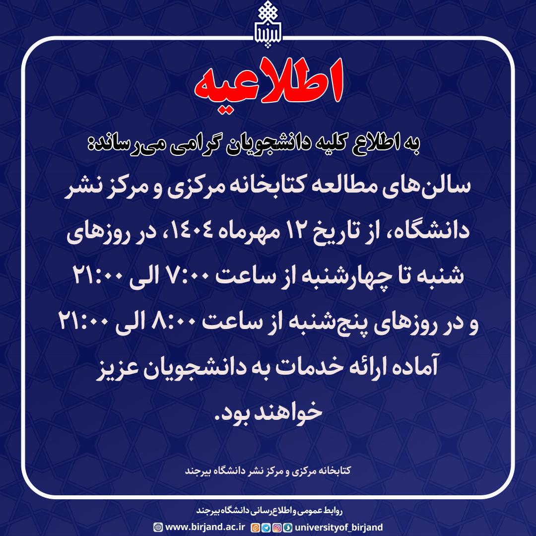 سالنهای مطالعه کتابخانه مرکزی و مرکز نشر دانشگاه، از تاریخ 12 مهرماه 1404، در روزهای شنبه تا چهارشنبه از ساعت 7:00 الی 21:00