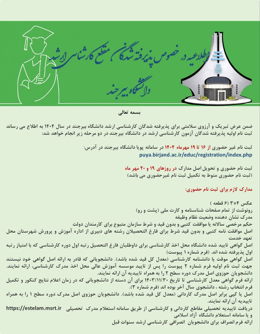 اطلاعیه در خصوص پذیرفته شدگان مقطع کارشناسی ارشد دانشگاه بیرجند ۱۵ مهر ۱۴۰۴ | ۱۳:۰۰ کد : ۳۲۰۲۸ اطلاعیه ها اطلاعیه های مهم ارسال به دیگران نام شما ایمیل شما ایمیل دریافتکننده ارسال انصراف تعداد بازدید:۱۱۱۶ ضمن تبریک به پذیرفته شدگان کارشناسی ارشد دانشگاه بیرجند در سال ۱۴۰۴ برای اطلاع از فرایند ثبت نام تصویر را مطالعه فرمایید.
