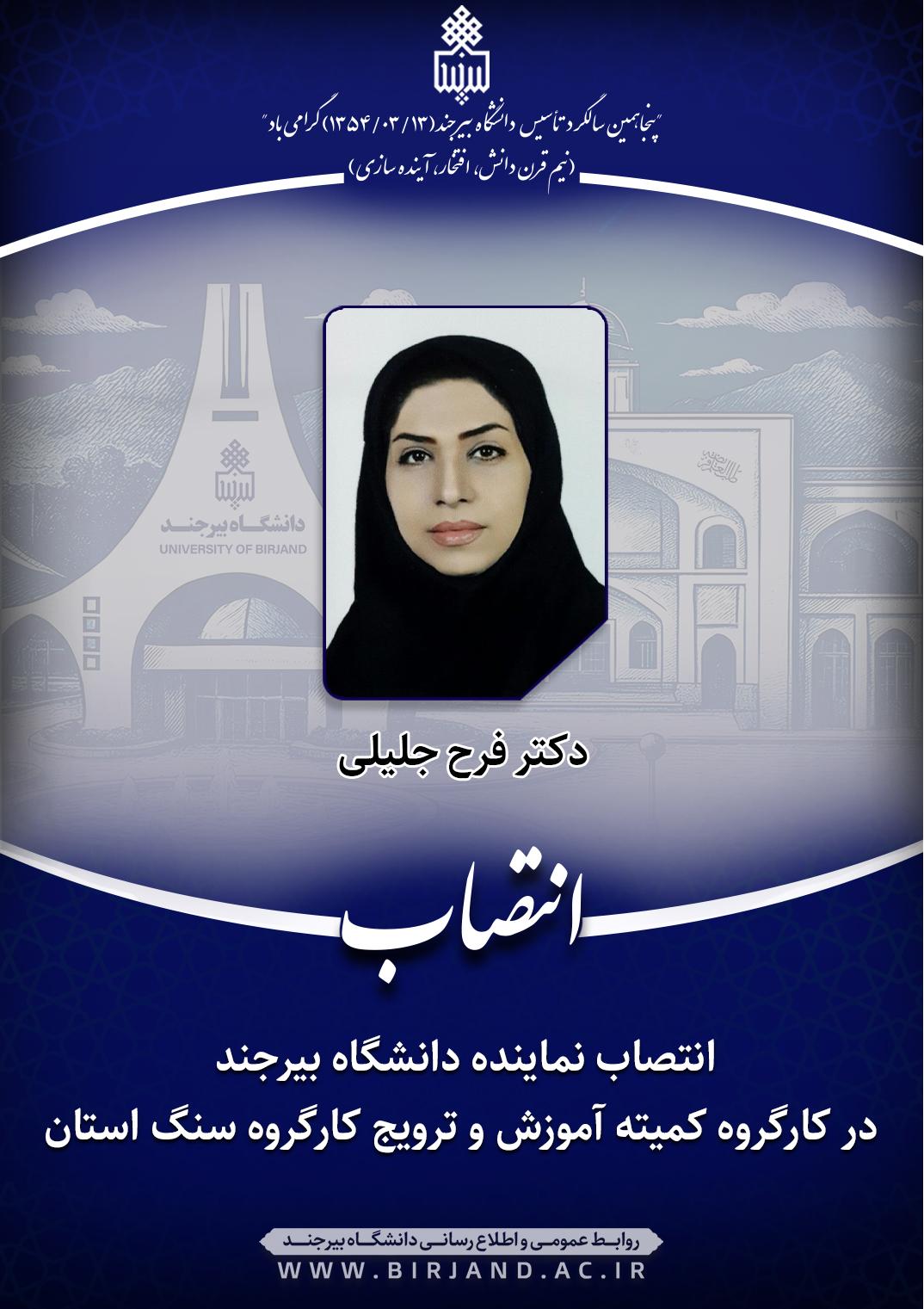 به گزارش روابط عمومی و اطلاع‌رسانی دانشگاه بیرجند، در ابلاغ انتصاب صادره از سوی حسن کامرانی‌فرد، مدیرکل آموزش فنی و حرفه ای استان به دکتر فرح جلیلی آمده است؛ با عنایت به برگزاری جلسه کمیته آموزش و ترویج ذیل کارگروه کمیته‌های تخصصی سنگ‌های قیمتی و نیمهقیمتی استان، بدینوسیله جنابعالی به عنوان عضو" کمیته آموزش و ترویج کارگرو سنگ استان" به مدت یکسال منصوب می گردید. امید است با بهره مندی از توان علمی و تخصصی جنبعالی شاهد ارتقا هرچه بهتر این کمیته باشیم.